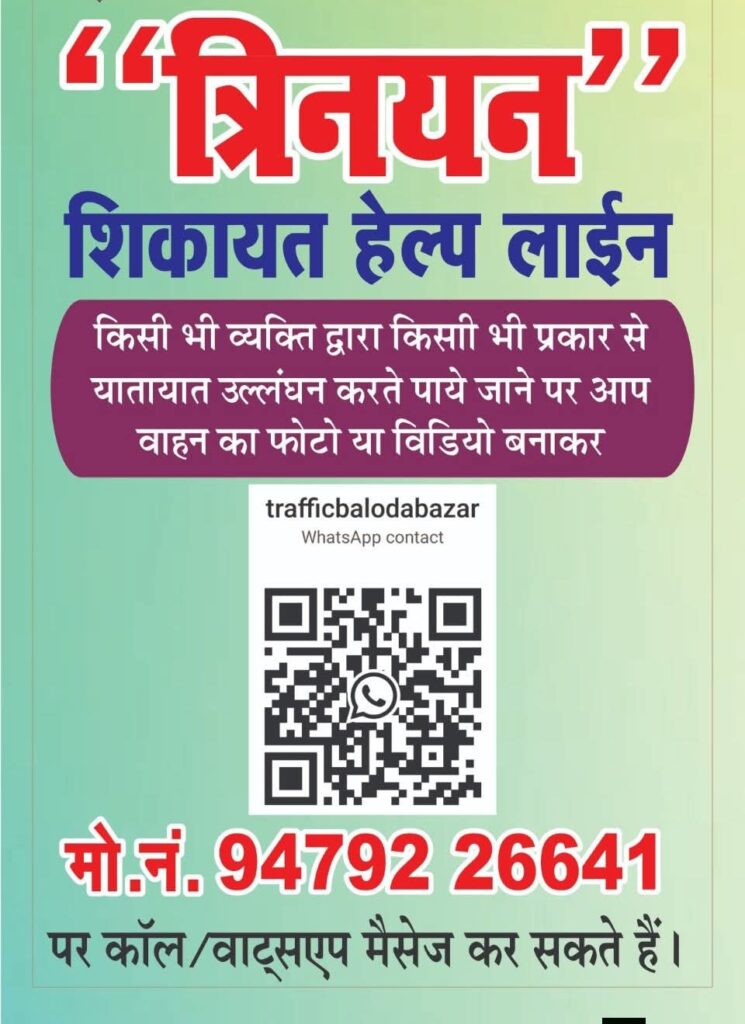 Md-Junaid Khan STATE REPORTER-CG CRIME बलौदाबाजार-भाटापारा। पुलिस द्वारा अभियान त्रिनयन शिकायत हेल्पलाइन नंबर जारी,यातायात नियमों का उल्लंघन करने वाले लोगों