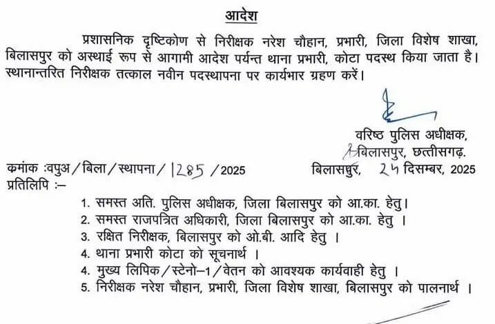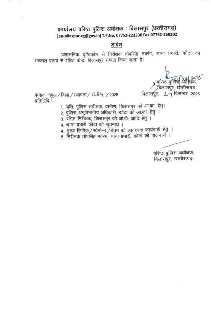 बिलासपुर। कोटा के मौजूदा थाना प्रभारी और विवादित पुलिस अफसर तोप सिंह नवरंग को हटा दिया गया है। कोटा थाने का प्रभार वापस लेते हुए उन्हें लाइन अटैच कर दिया गया है। बिलासपुर एसएसपी कार्यालय की तरफ से इस संबंध में आदेश जारी कर दिया गया है।