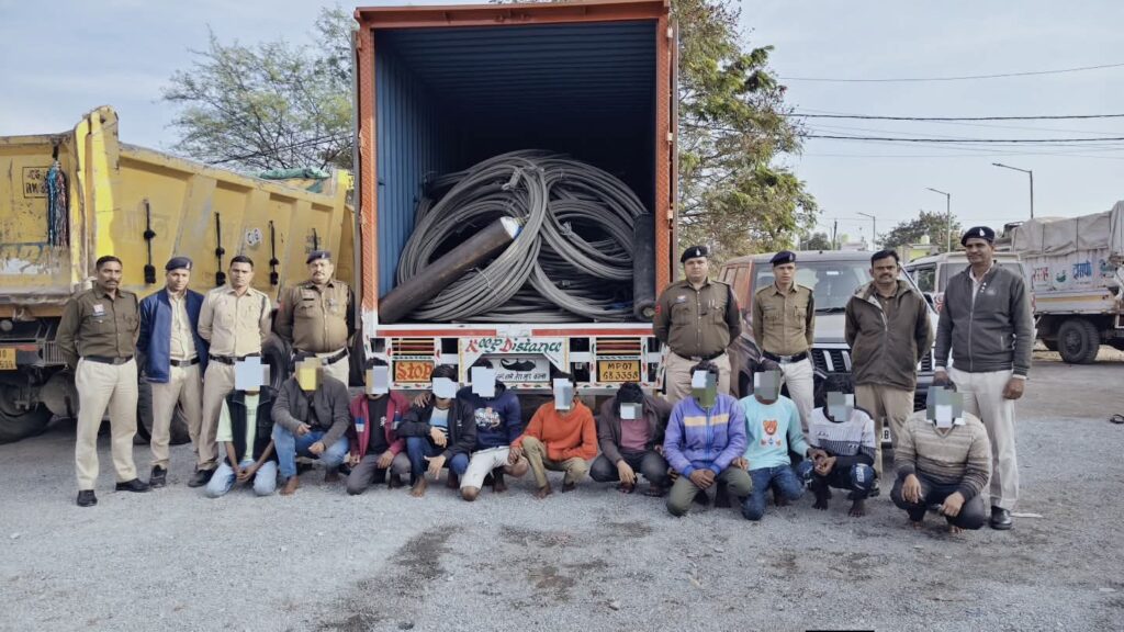 जांजगीर चांपा। जिले के अकलतरा पुलिस द्वारा अंतरजिला केबल तार चोरी गिरोह का पर्दाफाश करते हुए गिरोह के 11 सदस्य को गिरफ्तार किया है। सायबर टीम एवं थाना अकलतरा पुलिस की सक्रियता से आरोपियों को पकड़ने में मिली बड़ी सफलता। आरोपियों के कब्जे से भारी मात्रा में चोरी का तार/केबल करीब 12 टन कीमती 80,00,000 रूपये जप्त चोरी का तार/केबल करीब 12 टन, चोरी करने में प्रयुक्त गैस कटर, वायर कटर तथा ट्रांसपोर्ट वाहन कनटेनर, 01 बोलेरो निओ वाहन, 02 मोटर सायकल जप्त कुल कीमती 1 करोड 11 लाख रूपये आरोपियों द्वारा चोरी किये तार/केबल को राज्य से बाहर खपाने के फिराक में थे जिसको जांजगीर पुलिस ने धर दबोचा प्रकरण में संलिप्त अन्य फरार आरोपियों की पता साजी जारी थाना अकलतरा के अपराध क्रमांक 375/25 धारा 303(2) BNS. एवं अपराध क्रमांक 616/25 धारा 303(2) BNS तथा अपराध क्रमांक 655/25 धारा 303(2) BNS के तहत् आरोपीगणों के विरूद्ध कार्यवाही कर भेजा गया न्यायिक रिमांड पर