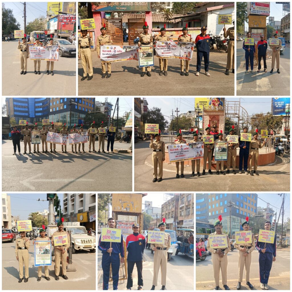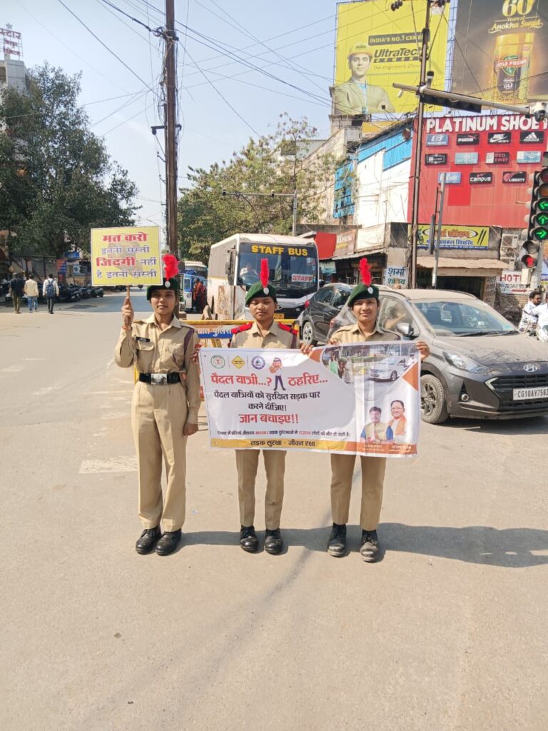 साथ ही NCC एवं NSS के छात्र छात्राओं द्वारा लेफ्टीनेंट आशीष शर्मा के नेतृत्व में नगर के प्रमुख चौक चौराहों में यातायात जागरूकता कार्य किया गया।