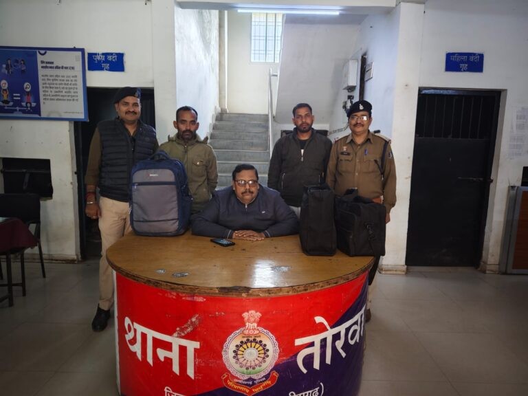 बिलासपुर। जिले के तोरवा पुलिस एवं साइबर टास्क टीम की संयुक्त कार्यवाही में अंतर्राज्यीय गांजा तस्करी का भंडाफोड़ करते हुए दो आरोपियों को गिरफ्तार किया है। आरोपियों के कब्जे से कुल 11.80 किलोग्राम मादक पदार्थ गांजा एवं दो मोबाइल फोन जब्त किए गए हैं। प्राप्त जानकारी के अनुसार तोरवा पुलिस द्वारा मुखबिर की सूचना पर आरोपी बहादुर सिंह राठौर, निवासी पेंड्रारोड जिला जीपीएम तथा इंद्रजीत कुरील निवासी कटनी जिला कटनी। हेमूनगर ओवरब्रिज के पास मैदान में दो संदिग्ध व्यक्ति भारी पीठ्ठू बैग लेकर खड़े हैं। सूचना की तस्दीक हेतु साइबर यूनिट व तोरवा पुलिस तत्काल मौके पर पहुंची। पुलिस वाहन देखते ही दोनों संदिग्ध भागने लगे, जिन्हें घेराबंदी कर पकड़ लिया गया। पूछताछ एवं बैग की तलाशी लेने पर दो अलग-अलग बैग में खाकी टेप से लिपटा कुल 11.80 किलोग्राम गांजा बरामद हुआ, जिसकी अनुमानित कीमत लगभग 1 लाख 32 हजार रुपये बताई जा रही है।