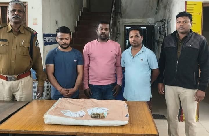 जांजगीर चाम्पा। पुलिस अधीक्षक श्री विजय कुमार पाण्डेय IPS के निर्देशन में जुआ, सट्टा पर प्रभावी अंकुश लगाने के लिए सख्त कार्यवाही की जा रही है। इसी क्रम में थाना बलौदा पुलिस द्वारा देर संध्या ग्राम नवगंवा गांव में रेड कार्यवाही कर जुआरियों को पकड़ा। पकड़े गए आरोपियों में 01. सुकांत विश्वास उम्र 34 वर्ष साकिन खैजा चैंकी पंतोरा 2. शशांक कहरा उम्र 33 वर्ष साकिन वार्ड क्रमांक 17 चंदनियापारा जांजगीर 3. मोहनलाल मधुकर उम्र 43 वर्ष साकिन बोकरेल थाना बलौदा । सभी आरोपियों के विरुद्ध
