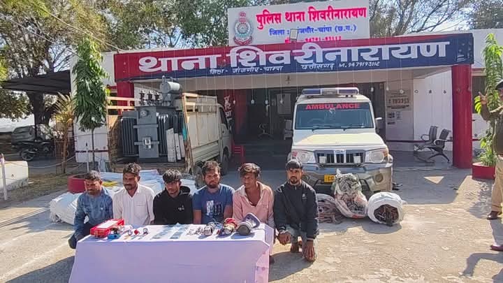 प्राप्त जानकारी के अनुसार शिवरीनारायण थाना क्षेत्र में विद्युत ट्रांसफार्मरों से कॉपर वायर चोरी की लगातार हो रही घटनाओं पर प्रभावी कार्यवाही करते हुए पुलिस ने पुलिस अधीक्षक श्री विजय कुमार पाण्डेय IPS के निर्देशन में एक संगठित चोरी गिरोह का पर्दाफाश किया है। इस गिरोह द्वारा ट्रांसफार्मरों से कॉपर/एल्युमिनियम वायर चोरी कर कबाड़ में खपाने का संगठित नेटवर्क संचालित किया जा रहा था।