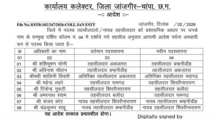 आदेश के अनुसार शशिभूषण सोनी को तहसीलदार अकलतरा से तहसीलदार बम्हनीडीह पदस्थ किया गया है, जबकि अविनाश चौहान को तहसीलदार बम्हनीडीह से तहसीलदार अकलतरा भेजा गया है। इसी प्रकार शालिनी तिवारी को अतिरिक्त तहसीलदार अकलतरा से अतिरिक्त तहसीलदार नवागढ़ पदस्थ किया गया है।