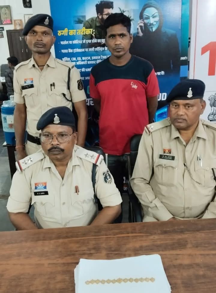 थाना चांपा पुलिस द्वारा त्वरित कार्यवाही करते हुए अज्ञात आरोपी की पतासाजी किया जा रहा था सीसीटीवी फुटेज एवं संदेह के आधार पर संदेही राहुल डेंसिल की पतासाजी कर संदेही को तलब कर पुछताछ किया गया जो दिनांक घटना को प्रार्थीया को 6 लाख रूपये पैसा दिलाने का झांसा देकर सोने का 13 फर वाला माला एवं पर्स मे बचे 13500 रूपये तथा टच वाला मोबाईल ले जाना स्वीकार किया तथा अपने मेमोरण्डम कथन में मोबाईल को फेंक देना और पैसे को खर्च करना तथा सोने के 13 फर वाला माला को अपने घर में रखना बताये जिसे जप्त कर आरोपी हरिशंकर ऊर्फ राहुल डेन्सिल का उक्त कृत्य अपराध धारा सदर पाये जाने से विधिवत् गिरफ्तार कर आरोपी के विरुद्ध धारा 318(4) भा.न्या.सं.के तहत कार्यवाही कर न्यायिक रिमांड पर भेज दिया है।
