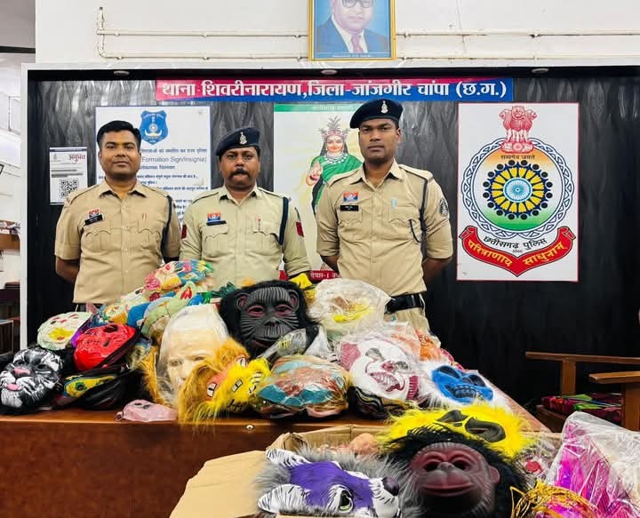 जांजगीर चांपा। शिवरीनारायण पुलिस की सख्त कार्यवाही डरावनी मुखौटा जप्त। होली पर्व के दौरान सुरक्षा व्यवस्था बनाए रखने के उद्देश्य से पुलिस द्वारा विशेष अभियान के तहत क्षेत्र की विभिन्न दुकानों की जांच कर डरावने एवं भ्रामक मुखौटे जप्त किए गए। पुलिस अधीक्षक श्री विजय कुमार पाण्डेय IPS के निर्देशन में एवं अतिरिक्त पुलिस अधीक्षक श्री उमेश कुमार कश्यप के मार्गदर्शन में जिले से शांति व्यवस्था बनाए रखने के लिए जांजगीर चांपा पुलिस द्वारा असामाजिक तत्वों के व्यक्तियों के विरुद्ध सक्त कार्यवाही की जा रही है। होली त्यौहारों में कुछ असामाजिक तत्व मुखौटों का उपयोग कर पहचान छिपाकर हुड़दंग, मारपीट या अन्य आपराधिक गतिविधियों को अंजाम दे सकते हैं। इसी आशंका को देखते हुए एहतियातन कार्यवाही की गई है।
