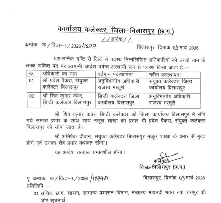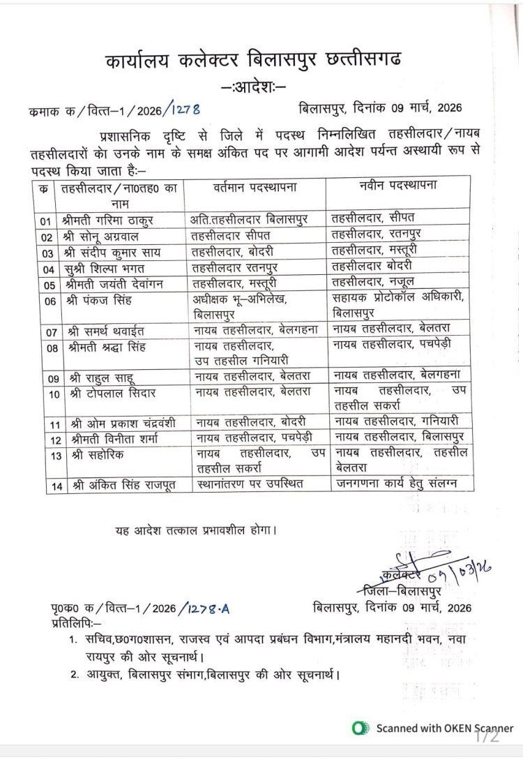 बिलासपुर | जिल कलेक्टर कार्यालय बिलासपुर द्वारा दो अलग-अलग आदेशों के तहत तहसीलदार-नायब तहसीलदारों के तबादले के साथ ही डिप्टी कलेक्टर और संयुक्त कलेक्टर स्तर के अधिकारियों की पदस्थापना की है। जारी आदेशों में विभिन्न तहसीलों और जिला कार्यालय में पदस्थ अधिकारियों को नई पदस्थापना दी गई है। जानकारी के अनुसार कलेक्टर कार्यालय से जारी आदेश क्रमांक क/वित्त-1/2026/1278, दिनांक 09 मार्च 2026 के अनुसार प्रशासनिक दृष्टि से जिले में पदस्थ तहसीलदार और नायब तहसीलदारों को उनके नाम के सामने अंकित पदों पर आगामी आदेश तक अस्थायी रूप से पदस्थ किया गया है। आदेश के तहत 14 अधिकारियों की जिम्मेदारियों में बदलाव किया गया है।