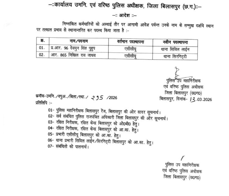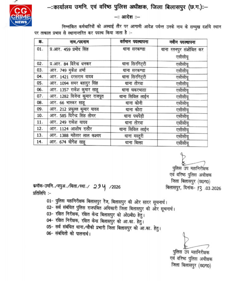 जारी आदेश के अनुसार थाना सरकंडा, सिविल लाइन, सिरगिट्टी, तोरवा, चकरभाठा, कोनी, कोटा, पचपेड़ी, मस्तूरी और बिल्हा सहित कई थानों में पदस्थ आरक्षकों को एसीसीयू में पदस्थ किया गया है।