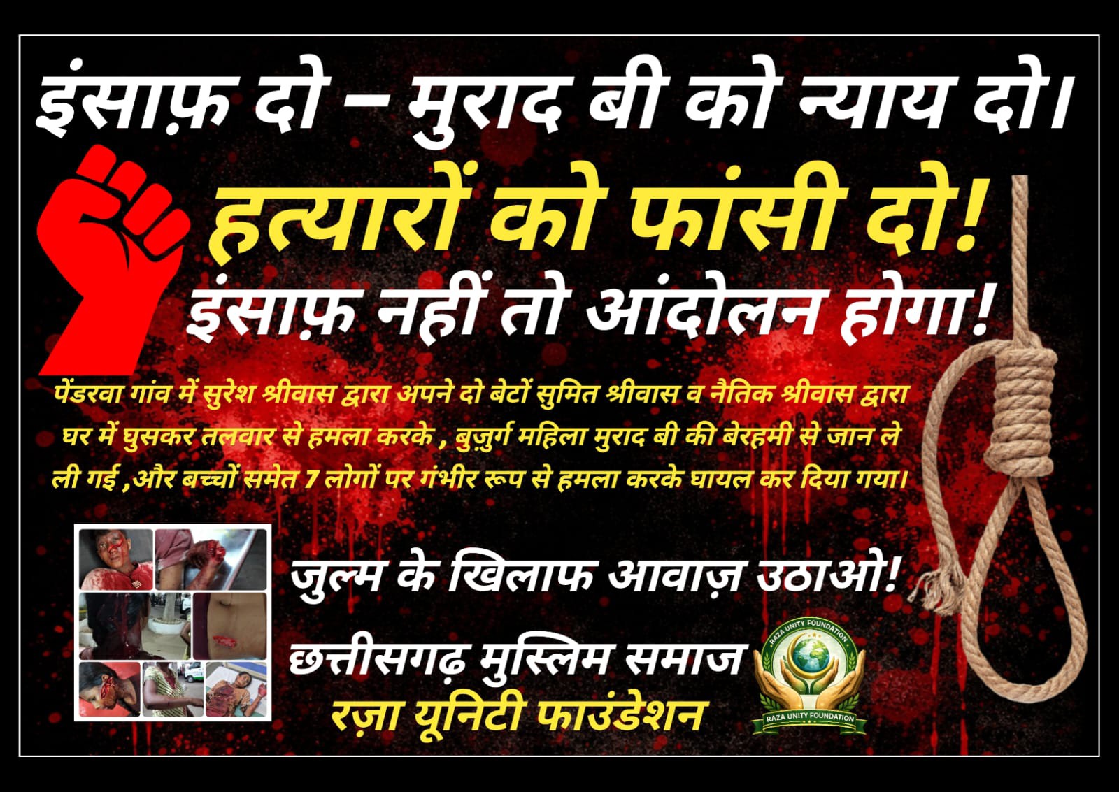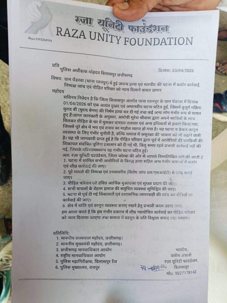 बिलासपुर। जिले के रतनपुर थाना क्षेत्र अंतर्गत ग्राम पेंडरवा में घर घूस कर महिला बच्चो पर धार दार तलवार से जानलेवा हमले करने वाले आरोपियों के विरुद्ध में रज़ा यूनिटी फाउंडेशन बिलासपुर द्वारा वरिष्ठ पुलिस अधीक्षक रजनेश सिंह को ज्ञापन सौंपा कर कड़ी कार्यवाही एवं निष्पक्ष जांच की मांग की करते हुए ज्ञापन सौंपा है।जानकारी के अनुसार 1 अप्रैल 2026 रतनपुर के ग्राम पेंडरवा में अवैध संबंध के शक में आरोपी सुरेश श्रीवास उसके साथी एवं नाबालिग दो बेटों द्वारा पीड़ित परिवार के घर घूस कर मुराद बी बुजुर्ग महिला की तलवार मार कर हत्या कर दी गई। वहीं घटना में परिवार के कई अन्य लोग भी गंभीर रूप से घायल हुए हैं।