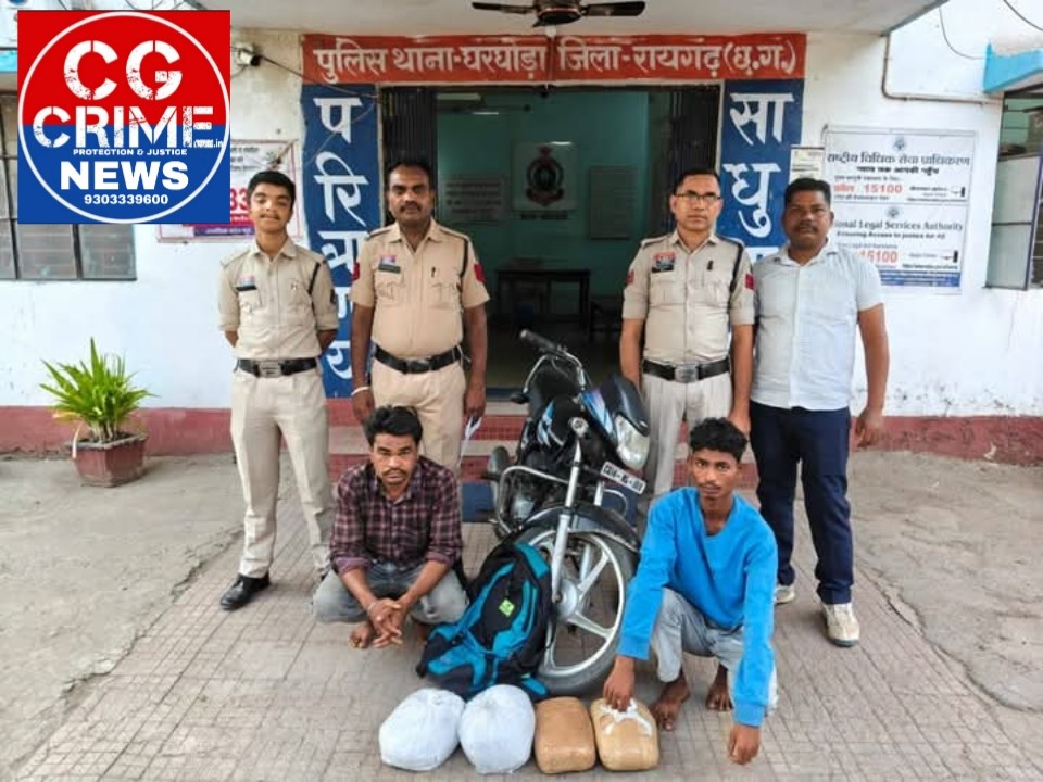 तीसरी कार्यवाही 09 अप्रैल 2026 को थाना घरघोड़ा पुलिस द्वारा की गई, जिसमें थाना के सामने लैलूंगा रोड पर नाकेबंदी कर एक हीरो एचएफ डिलक्स मोटरसाइकिल (CG 14 ML 1015) में सवार दो व्यक्तियों को पकड़ा गया। पूछताछ में उन्होंने अपने नाम विजय सिदार और शिवव्रत सिदार बताए। तलाशी के दौरान उनके पास रखे बैग से कुल 03 किलो 500 ग्राम गांजा बरामद हुआ, जिसकी कीमत ₹1,75,000 आंकी गई। साथ ही घटना में प्रयुक्त मोटरसाइकिल एवं मोबाइल फोन भी जब्त किए गए। आरोपियों के विरुद्ध थाना घरघोड़ा में एनडीपीएस एक्ट के तहत अपराध दर्ज कर दोनों को गिरफ्तार कर न्यायिक रिमांड पर भेजा गया।
