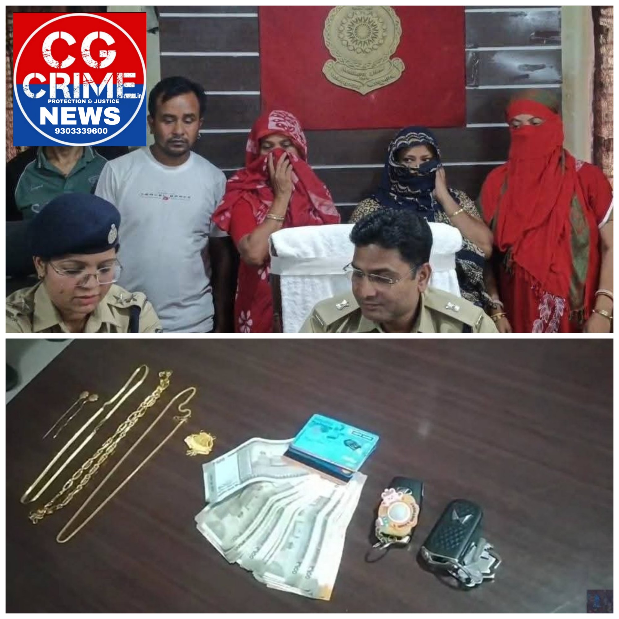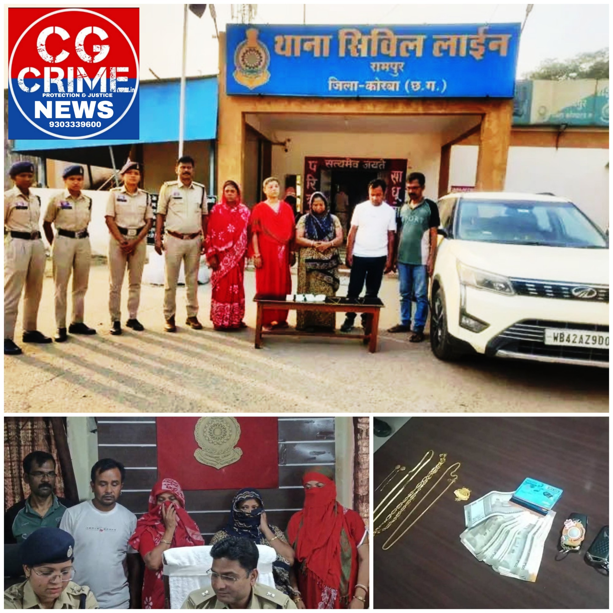 कोरबा। थाना सिविल लाइन रामपुर द्वारा त्वरित एवं प्रभावी कार्यवाही करते हुए ज्वेलरी दुकान में हुई चोरी की घटना का महज 18 घंटे के भीतर खुलासा कर अंतर्राज्यीय गिरोह के 05 आरोपियों को गिरफ्तार कर लिया है। जानकारी के अनुसार प्रार्थी अखिल कुमार देवांगन निवासी एमपीटी नगर, थाना सिविल लाइन रामपुर द्वारा रिपोर्ट दर्ज कराई गई थी कि दिनांक 24.04.2026 को लगभग 12:15 बजे उसकी “दिव्या ज्वेलर्स” दुकान में तीन महिलाएं ग्राहक बनकर आईं और मौका पाकर सोने के आभूषण चोरी कर फरार हो गईं।